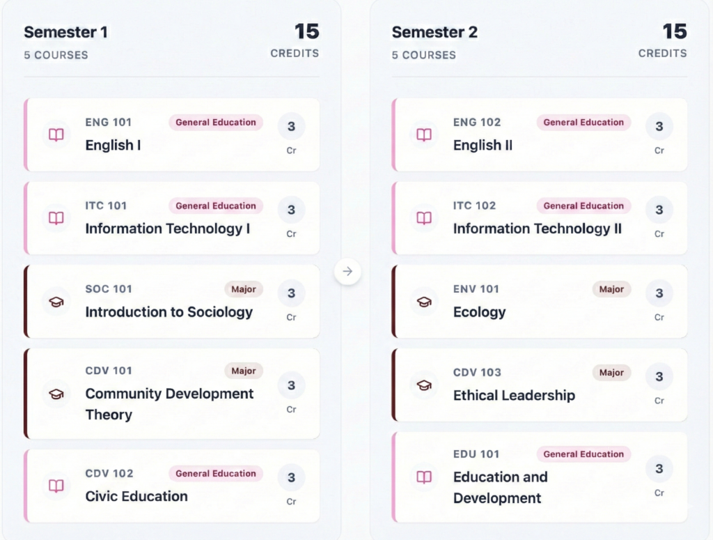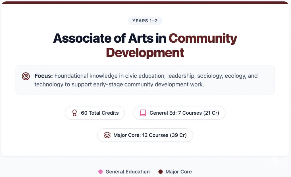 - Focus: Foundational knowledge in civic education, leadership, sociology, ecology, and technology to support early-stage community development work.